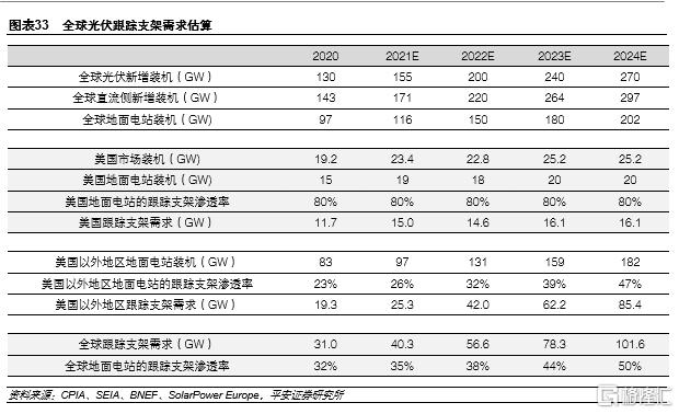 我們估算,2020-2024年全球跟蹤支架需求的複合增速(按容量)有望達到34%,美國以外地區的跟蹤支架需求增速有望達到45%。