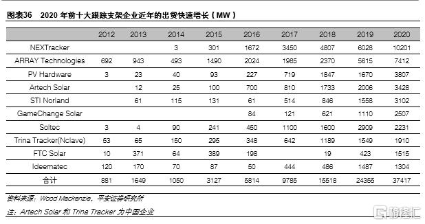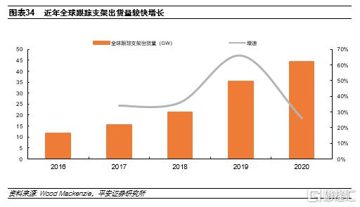 近年,隨着光伏需求的增長以及跟蹤支架性價比的提升,全球跟蹤支架出貨量呈現快速增長。根據Wood Mackenzie統計,2020年全球光伏跟蹤支架出貨量44.4GW,同比增長26%;跟蹤支架市場需求的快速的增長也推動了主要跟蹤支架企業出貨量的快速增長。