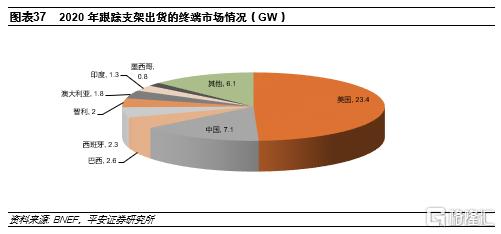 美國是全球最大的跟蹤支架市場,按照彭博新能源的統計,2020年全球跟蹤支架出貨47.5GW(與Wood Mackenzie統計口徑略有差異),其中美國市場需求23.4GW,佔比約50%;據估算,2020年約有11.7GW的跟蹤支架以囤貨的方式用來鎖定投資税收抵免優惠,這部分支架將用在2020年之後的項目建設,推算美國2020年實際應用的跟蹤支架約11.7GW,相當於美國2020年地面電站新增裝機的80%。除了美國和中國以外,拉丁美洲、西班牙、澳大利亞、印度、中東等光照條件比較好的地區的跟蹤支架需求也較為旺盛,整體看美國以外地區跟蹤支架滲透率遠低於美國。