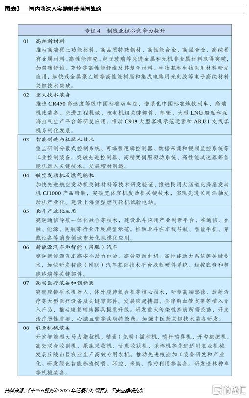 “硬科技”勢在必行。全球產業的格局由割裂到融合,又由全球化向屬地化方向變化,如何“補足短板、佔得先機、去蕪存菁“,將是國內未來發展的時代要義。過去全球的主基調之一是發展,體現為推動GDP的持續增長,而未來則會更多着眼於穩定,這其中“碳中和”、“製造業”是兩大抓手。國務院提出到2035年我國關鍵核心技術實現重大突破,進入創新型國家前列:聚焦新一代信息技術、生物技術、新能源、新材料、高端裝備、新能源汽車、綠色環保以及航空航天、海洋裝備等戰略性新興產業,加快關鍵核心技術創新應用,增強要素保障能力,培育壯大產業發展新動能。電力設備新能源行業承載了達成國家“製造強國”和“碳達峯、碳中和”戰略的雙重使命,無論是已競逐全球市場的新能源汽車、風光新能源,還是在奮力追趕的工業自動化領域,都在技術迭代中不斷夯實“硬科技”。
