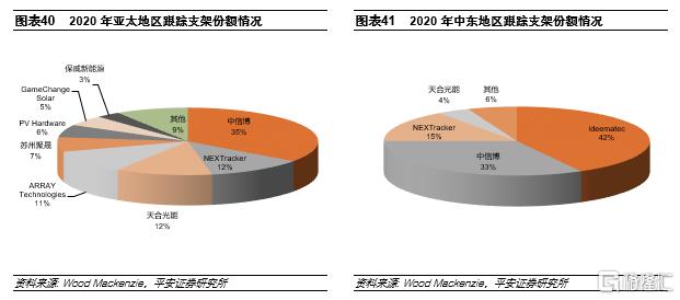 與NEXTracker、ARRAY Technologies等美國跟蹤支架巨頭相比,國內跟蹤支架企業起步相對較晚;近年,國內企業通過加大研發投入,聚焦高端產品,跟蹤支架快速迭代,產品質量已能比肩海外龍頭,以中信博為代表的國內跟蹤支架企業正在快速崛起。2020年,中信博跟蹤支架出貨量全球排名第四,在亞太、中東等市場,公司的市佔份額處於領先地位,反映了國內企業的產品競爭力。