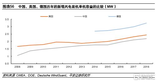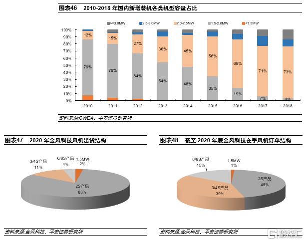 長期以來國內風機單機功率低於海外主要國家,不利於國內風機企業參與海外競爭。長期以來,受技術、風資源條件等因素影響,國內風機單機容量偏小,2018年,國內平均單機容量2.18MW,約德國平均單機容量的67%。2017年,維斯塔斯新增風機訂單中,4MW平台產品(單機容量3.45-4.2MW)訂單的佔比約三分之二,2MW平台產品訂單佔比約三分之一,説明當時海外的陸上風機需求已經以3-4MW機組為主,而如上所述,2020年金風交付的風機產品中,2S產品(單機容量2-3MW)容量佔比超過80%。因此,由於國內主流風機產品單機容量相對較小,國內風機企業參與海外市場競爭面臨一定劣勢。