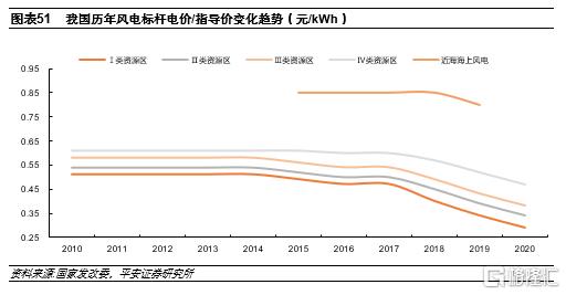 近年風機技術的快速迭代是風電行業去補貼倒逼的結果。從近年的北京國際風能展上主流風機企業推出的新機型可以看出,風機技術進步的速度在加快,葉輪直徑和單機容量快速增長,其中原因包含風電行業去補貼倒逼的影響。從2010-2014年,風電標杆上網電價保持穩定,2015年小幅降低一至三類地區標杆電價,2017年以來,風電標杆電價快速下降,2019年國家發改委發佈《關於完善風電上網電價政策的通知(發改價格〔2019〕882號)》,明確2021年新核准陸上風電項目不予補貼;在此背景下,風機企業不得不加快技術創新的步伐,單機容量的大型化則是風機企業應對行業快速去補貼的結果。此外,近年光伏行業迅猛發展,也一定程度倒逼風機加快技術進步步伐。