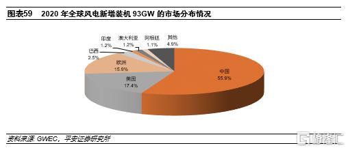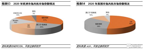 國內風機企業參與海外市場競爭的力度較小。海外長期以來,海外風機市場由海外的以維斯塔斯、GE、西門子-歌美颯為代表的風機巨頭把持,國內風機企業較少參與海外市場的競爭,金風科技十三五期間風機出口規模約2.9GW,同比增長約204%,約佔公司十三五對外銷售總量的8%左右。2020年,全球風電主要的海外市場是美國和歐洲,合計約佔海外市場總量的75%,這兩個大的海外市場主要由海外風機企業主導。