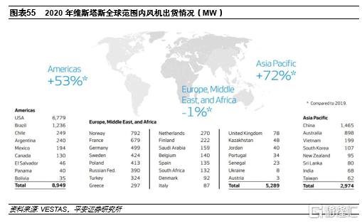全球化佈局成就海外風機巨頭。海外主要的風機企業包括維斯塔斯、GE、西門子-歌美颯等,其中丹麥企業維斯塔斯是全球最大的風機企業,2020年風機出貨達到17.2GW,根據Wood Mackenzie的統計,2020年維斯塔斯在海外陸上風機市場的份額達33.7%。整體看,維斯塔斯在全球的佈局較為均衡,2020年風機銷往全球40個國家和地區。