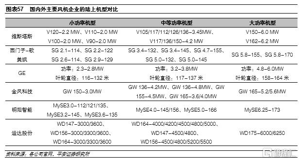 國內風機企業在風機單機容量方面已經呈現趕超海外之勢。隨着近年國內風機技術迭代的加快,國內風機企業面向市場的產品已經全面升級,從單機容量角度來看,2MW級別的產品已經基本退出,單機容量3.6MW以上的產品成為主流產品,單機容量6MW以上的產品開始湧現並獲得訂單。而海外市場競爭格局相對穩定,以美國為代表的主要海外風機市場基本處於由GE、維斯塔斯、西門子-歌美颯三家寡頭壟斷的格局,近年風機產品迭代速度相對較慢。目前,海外風機巨頭在單機容量方面相對國內企業不佔優勢,而從葉輪直徑來看,國內陸上主流風機產品的葉輪直徑即將邁入以160米及以上為主流的時代,大概率將在未來一兩年超過海外。