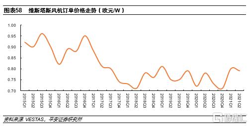 單機容量趕超的同時,價格優勢將會更明顯。如上所述,國內風機大型化帶來較明顯的招標價格下降,從維斯塔斯披露風機訂單價格來看,海外風電機組價格近三年穩定在0.7-0.8歐元/W(摺合人民幣5.3-6.1元/W)之間,明顯高於國內市場價格。因此,從成本端看,國內風機企業的競爭力也呈現邊際提升。
