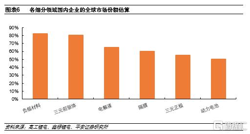 2)中國企業具備最高的全球份額:全球鋰電產業鏈經歷了日本一家獨大、韓國搶佔份額再到中國後來居上的發展歷程,目前中國企業在大部分細分環節都具有最高的全球份額。具體來看,三元前驅體和負極的全球市佔份額近80%,為產業鏈中最高的兩大環節(不考慮磷酸鐵鋰);電解液、動力電池和隔膜的全球市佔率在60%-70%,三元正極材料的份額低於60%。
