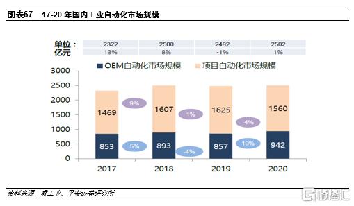 根據睿工業的數據,20年國內工業自動化市場規模為2502億元,其中項目型市場規模為1560億元,OEM市場規模為942億元。按照中國市場佔全球市場規模約四分之一左右進行估算,則工業自動化的全球市場規模超過1萬億元。近年來隨着國內製造業的自動化升級及半導體、鋰電等新興行業的大規模擴產,工控行業呈現較高的景氣度,從行業增長的驅動因素來看,短期因素包括新基建投資落地和新興產業的快速擴張,長期因素則是疫情之後機器替代人工的趨勢進一步強化以及政策對芯片等短板行業的扶持力度加強。