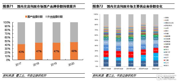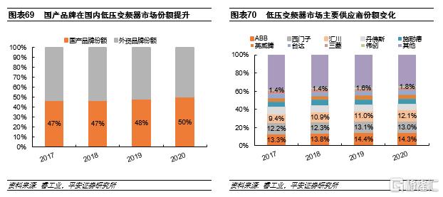 在低壓變頻器、伺服驅動等市場,從17年開始,國產品牌隨着技術能力的提升,份額持續上升。展望未來,我們預計在國內工控市場,整體競爭格局將呈進口替代加速之勢。國產品牌除了在技術上的持續追趕和客户服務上的固有優勢之外,另一驅動份額上升的重要因素是在20年疫情期間,國產品牌抓住了外資由於產能問題導致無法及時交付的機會,快速響應客户,在多個行業突破了外資建立的品牌壁壘。以伺服產品為例,在國內自動化市場,從產品定位來看大致的排序是歐系>日系>國產品牌,近幾年國產品牌在技術上已經追平台系品牌,與日系品牌的差距也越來越小,但是此前受制於品牌認可度,在高端包裝、半導體上游環節等複雜應用領域,難以進入日系佔據較多份額的市場。在20年的疫情中,部分日系品牌由於復工較晚產品交期延遲,國產品牌通過保障伺服和PLC產品的及時交付,進入了多個高端客户的供應體系。從客户品牌選擇角度來看,一旦原有供應商建立的品牌壁壘被打破,新進供應商憑藉價格、服務等優勢,份額有望快速上升。因此,在新進客户中份額的上升預計將推動國產品牌市佔率的不斷提高。