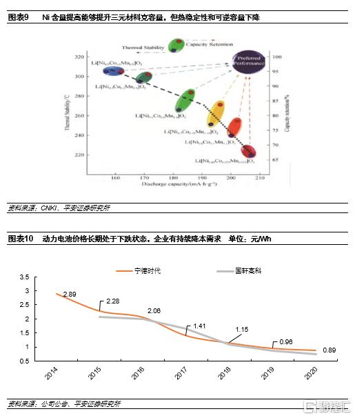 高鎳為正極材料主流發展方向之一。鎳含量的提高能夠提升正極材料的克容量,從而提升電池能量密度。目前量產NCM811的電芯能量密度普遍在240-260Wh/kg之間,成組後系統能量密度超過170Wh/kg,而NCM523的能量密度一般在200-210Wh/kg,隨着鎳含量的增減,能量密度還有進一步提升的空間。但高鎳低鈷化降低了電池的倍率性能和穩定性,電池企業需要在高能量密度和安全穩定性之間做出取捨、兼顧和平衡。另一方面,高鎳體系由於降低價格昂貴的鈷金屬用量,可以降低電池生產成本。