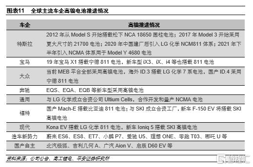 車企加快高鎳電池裝機。儘管目前國內市場磷酸鐵鋰有回潮趨勢,但在高端車型和海外市場方面,高鎳三元仍然是主流的發展趨勢。海外車企在高鎳電池方面的裝機較早。特斯拉從Model系列開始便採用松下的NCA電池,隨着供應商的多元化,NCM811和NCMA等其他高鎳路線也相繼被採用;現代Kona EV早在18年便發佈了搭載LG 8系電池的版本;國內蔚來等造車新勢力從19年開始搭載國內大廠的8系電池;之後大眾、奔馳等歐洲車企以及福特、通用等美系車企也相繼推出採用高鎳電池的新車型。從車企動向來看,高鎳已是大勢所趨。