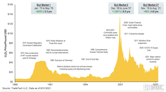 最近一輪鈾礦的牛市,發生在2003年至2007年,持續了6年多,價格上漲了幾十倍,在2008年最高達140美元/磅。然而由於福島事故所造成的一系列不利影響,使得鈾價出現了一輪大幅度的下跌。