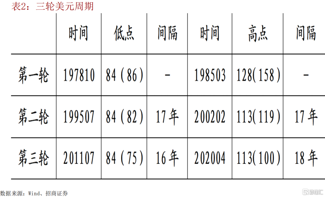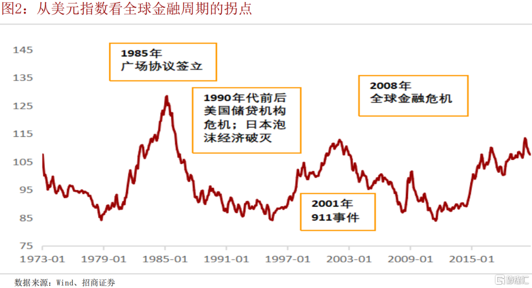 如果從價格指標-美元指數來看,過去50年經歷了兩輪半全球金融 週期。