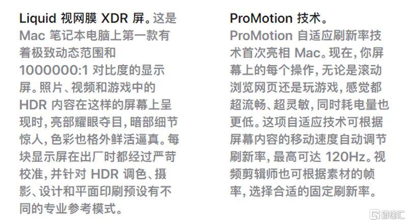 新款MacBook Pro分為14英寸和16英寸兩種尺寸,屏幕邊框變得更窄,並且像iPhone一樣變為“劉海屏”,搭載了Liquid視網膜XDR屏。它還配備了ProMotion自適應刷新率技術,這種技術會根據用户當前所做的事情,自動調節屏幕刷新率,以帶來更靈敏的響應。