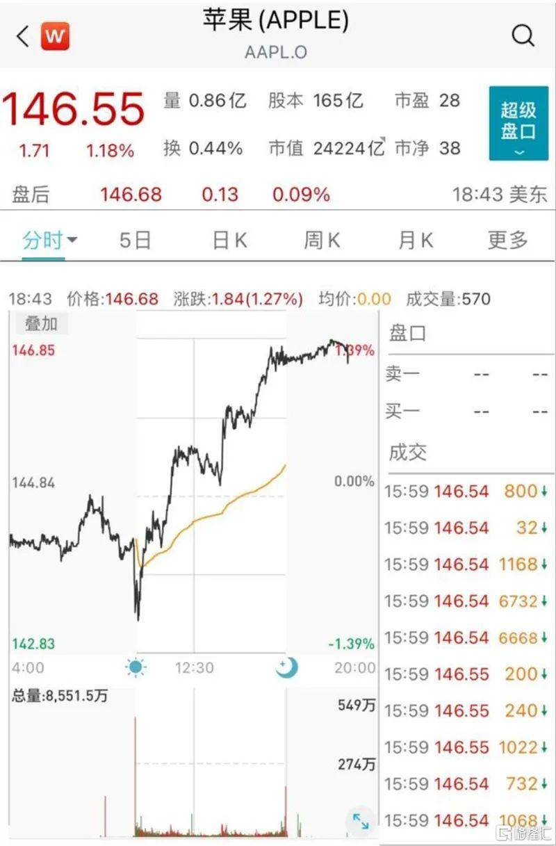 在當日的美股交易中,蘋果股價上漲超過1%。