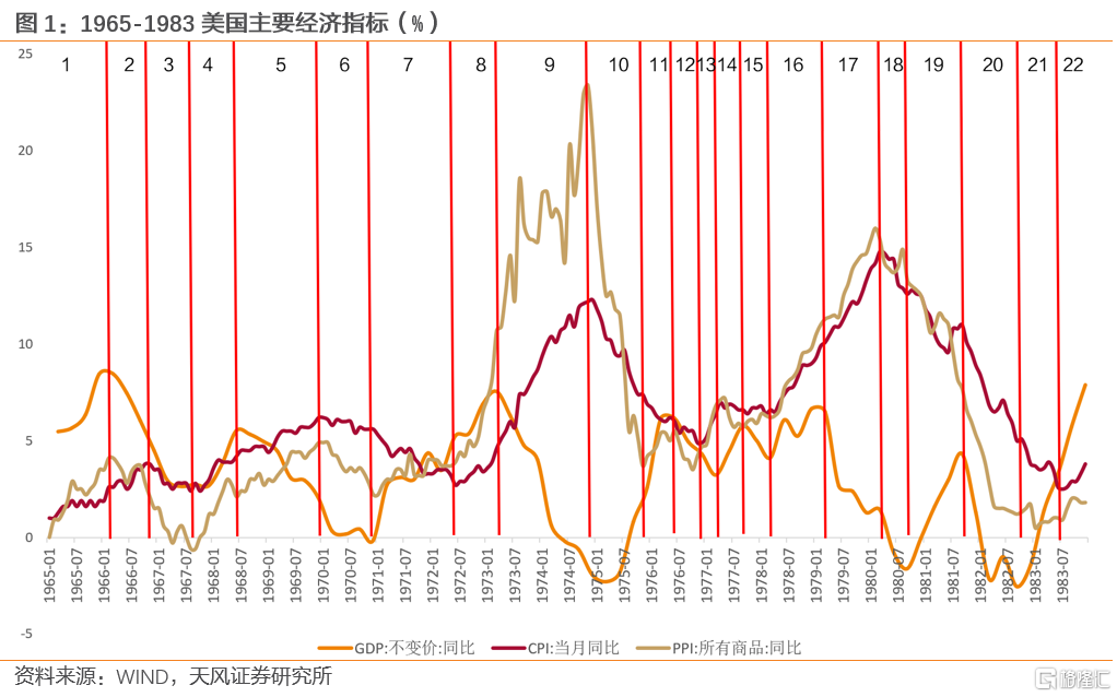 本文通過對1960s-80s美國經濟背景及權益市場表現的研究,以史為鑑探究中國可能的市場走勢及分化。上世紀60年代末到80年代初美國共經歷了三次較為典型的滯脹,通過觀察PPI、CPI與GDP同比增長這三個經濟指標形成的不同經濟組合,我們將1965-1983年美國劃分為20個不同的經濟階段。若以通脹走勢(以PPI為主)和GDP增速走勢的不同可劃分為4大類經濟組合