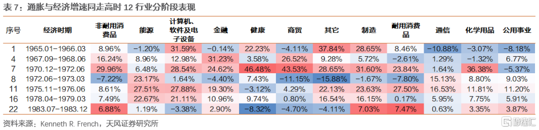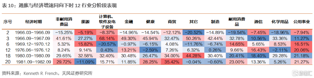 但由於能源價格上漲,汽車為代表的耐用消費品表現慘淡,尤其是通脹向上經濟增速向下時市場表現極差,不過值得關注的是兩次能源危機結束時(10、11、20、21、22代表時期)耐用消費品由於積壓需求的釋放,行業有不錯的市場表現