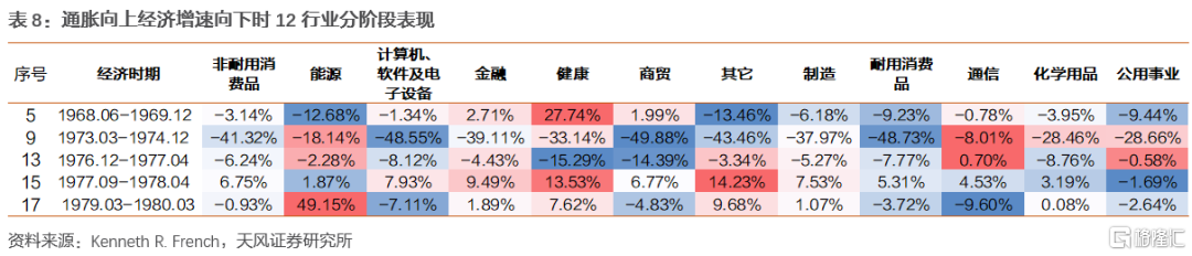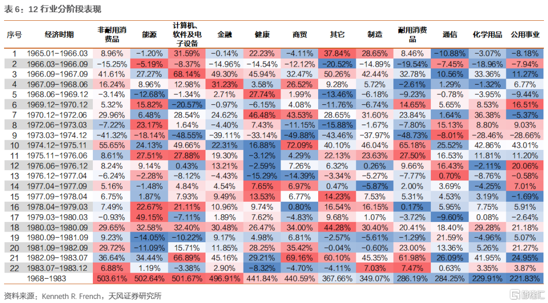 經濟不好時,非耐用消費品和商貿階段表現較差;受益於能源危機能源行業防禦性和上漲動能較好;相對較高的利率環境下金融行業防禦性良好健康行業除1976.12-1977.04(13)時期外表現均良好;由於能源價格上漲耐用消費品行業表現極差
