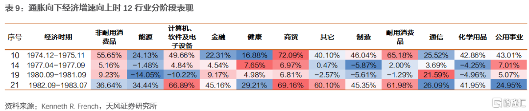 3)通脹向下經濟增速向上包括1974.12-1975.11、1977.04-1977.09、1980.09-1981.09、1982.09-1983.07(10、14、19、21),一般發生於滯脹壓力緩解和經濟改善的階段