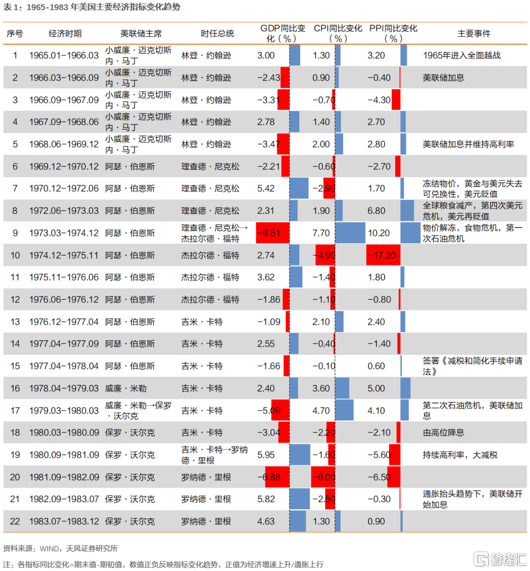 2)通脹向上經濟增速向下包括1968.06-1969.12、1973.03-1974.12、1976.12-1977.04、1977.04-1978.04、1979.03-1980.03(5、9、13、15、17),此時期通脹與經濟增速的背離