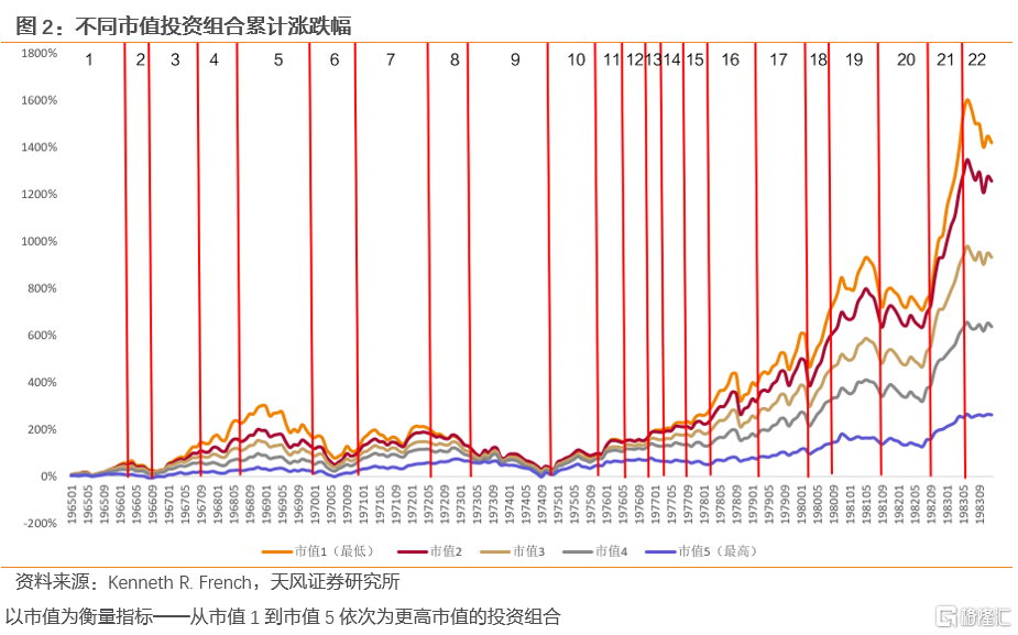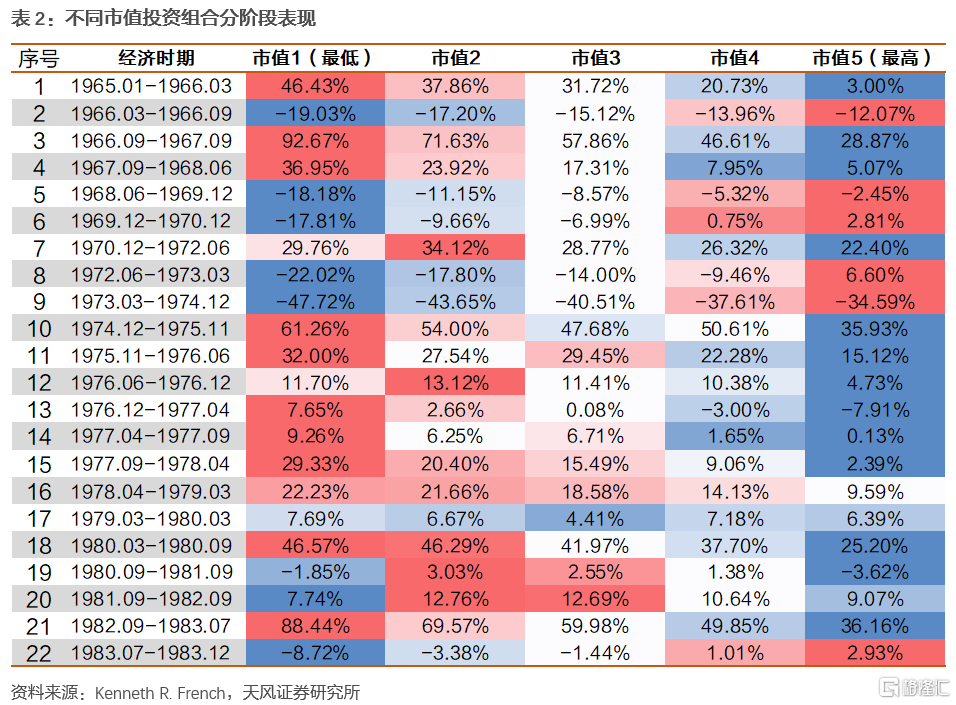 按Kenneth R. French以市值為指標對美股劃分,1965-1983美股大中小盤分階段表現出顯著特徵
