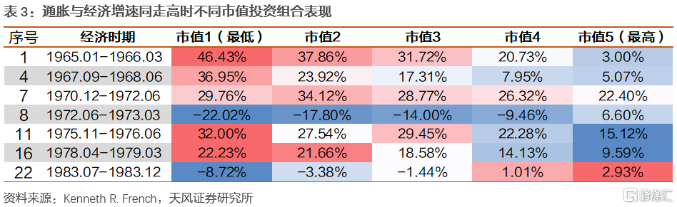 1)1975年是美國權益市場大小盤分化的分界點。1975年後,由於利率高企、科技進步等原因,美股開啟了歷史上最久的小盤股行情。1975年前,則基本遵循上漲時小盤股勢頭更勁,下跌時大盤股底盤更穩的原則。分經濟組合觀察,通脹與經濟增速同走高時呈現顯著的小盤股風格,其餘時期風格前後不一貫