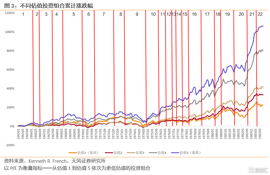 繼續採用Kenneth R. French以P/E為指標對美股劃分,1965-1983美股不同估值組合表現出較大差異性