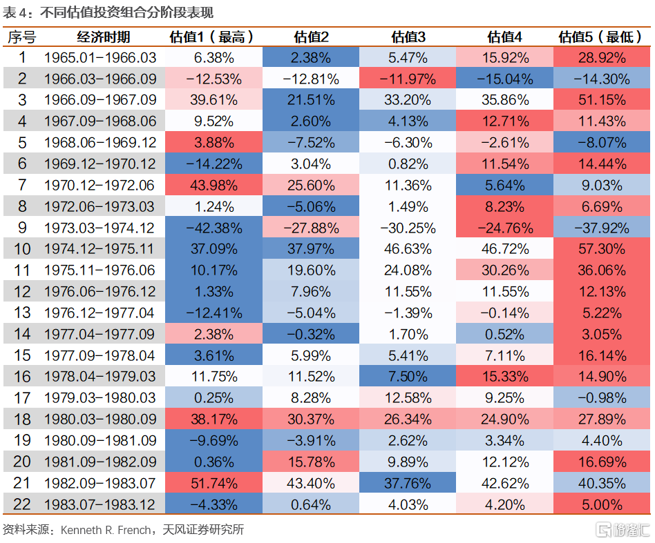 總結來説,1965-1983年間絕大部分時期低估值組合有優秀的市場表現,但在三次典型滯脹期低估值組合表現均不佳,中高估值組合有良好的市場表現。分經濟組合觀察,通脹向上經濟增速向下時市場整體表現相對較差,中等估值的組合在所有時期都有較好的表現。