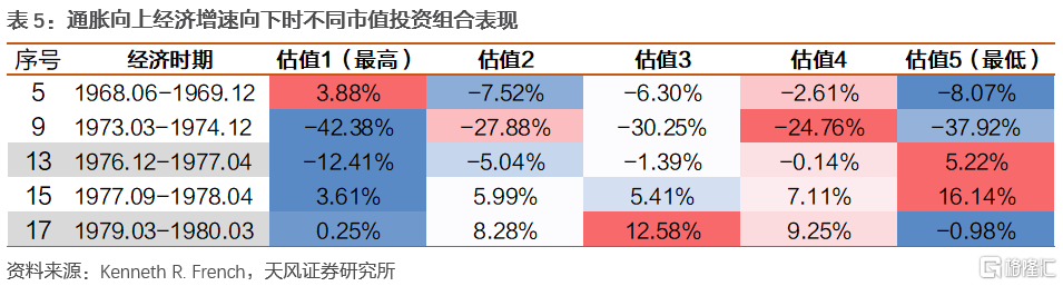 通脹向上經濟增速向下(5、9、13、15、17):此經濟組合下市場整體表現相對較差,中等估值的組合(估值4)在所有時期都有較好的表現,三次典型滯脹期(5、9、17)低估值組合表現均較差
