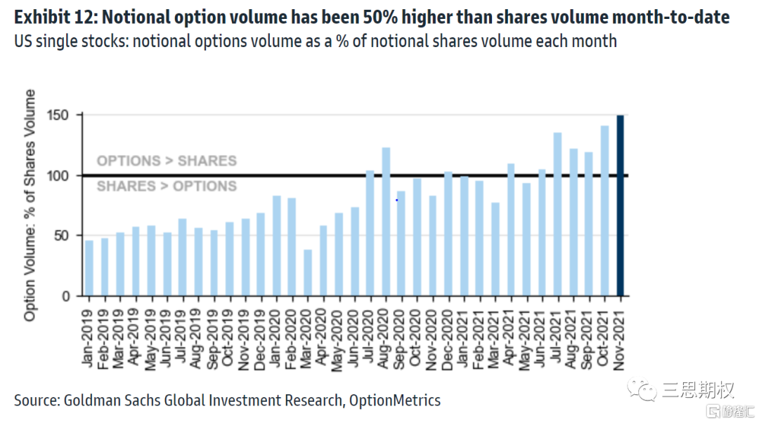 個股期權的交易量不僅僅是已經接近指數期權,而且2021年下半年之後已經高於個股股票本身的交易量。這是否意味者美國股票市場馬上要進入期權時代了?