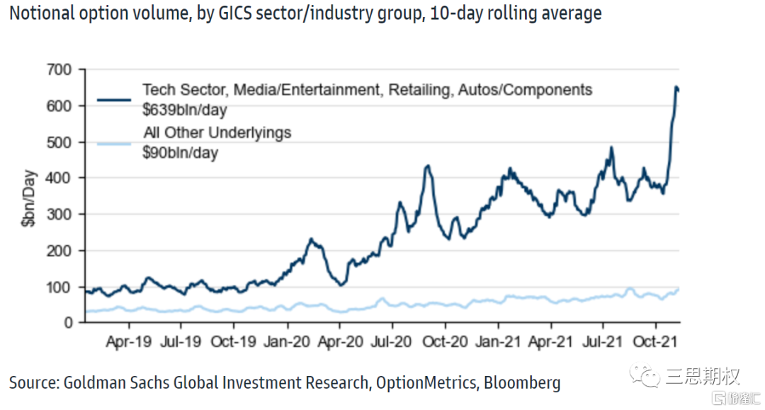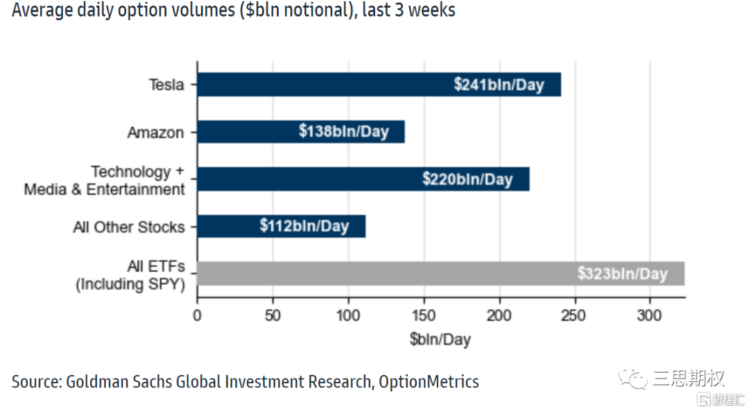 我們在細分至個股來看,特斯拉,亞馬遜兩隻股票背後的期權交易量就已經超過了其他股票交易量的總和,並且十分接近機構玩家主導的指數期權市場的總量!