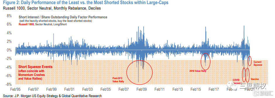 如果期權交易量過大,而且通常來說散戶交易都集中在買入看漲期權上,那麼最典型的影響便是個股會不定時的出現Gamma擠倉(gammasqueeze)的現象【注:我們之前的文章《軟銀是怎樣用Gamma把市場玩壞的》也詳細的聊到過這個問題】。這個現象前段時間在特斯拉身上就出現過,如果股票背後有大量的做空倉位,擠倉的就更加明顯。根據摩根大通的統計,今年2月份GME事件當中,那些被大量做空的股票由於被擠倉,大幅度跑贏那些沒有被做空的股票。因此,如果個股期權持續保持活躍的話,那麼未來這類擠倉風險就會更加頻繁出現。