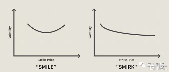 通常來講股票的波動率微笑都呈左高右低的態勢,這是因爲左邊看跌期權的波動率一般要比看漲期權波動率要高,波動率形態上叫Volatilitysmirk (下圖右)。而個股看漲期權需求暴增會導致波動率曲面(volatilitysurface)變形,變得更像波動率微笑(下圖左),波動率偏度(skew- 即看跌期權隱含波動率與看漲期權隱含波動率的差)下降。