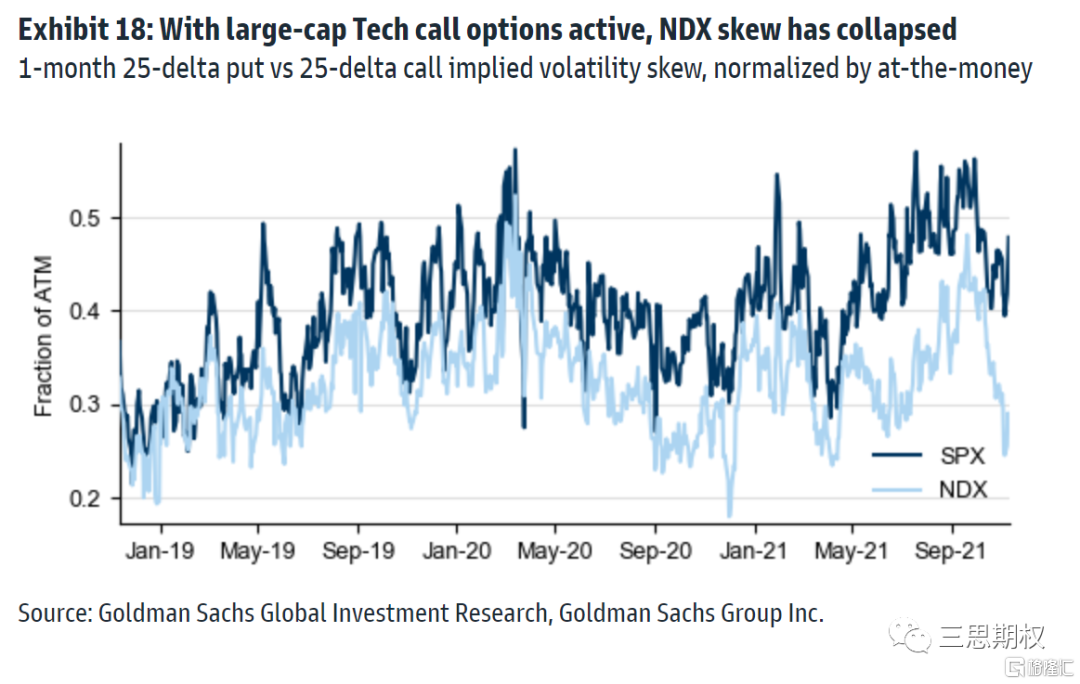 正是因爲上述原因,最近特斯拉以及亞馬遜等科技股的看漲期權需求大增導致了這些股票的看漲期權的隱含波動率上升,形成波動率微笑。而由於這些個股在納指的權重又比較大,因此個股的變動也傳導至了納指波動率曲面,導致納指的波動率偏度(skew)大幅度下挫。