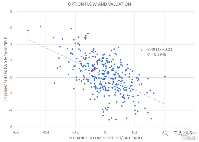 我們看到一個有意思的統計,觀測標普500指數看跌期權與看漲期權交易量之比與未來一年時間裏指數P/E比值變動的關係。下圖告訴我們,當越多人買看漲期權,那麼PUT/CALL交易量比值下跌我們通常會見到未來一年裏標普500指數的P/E上漲,反之亦然。換句話說, 就是如果看漲期權的交易量相對看跌期權大幅上升,那麼未來一年裏標普500的估值通常還會上升。