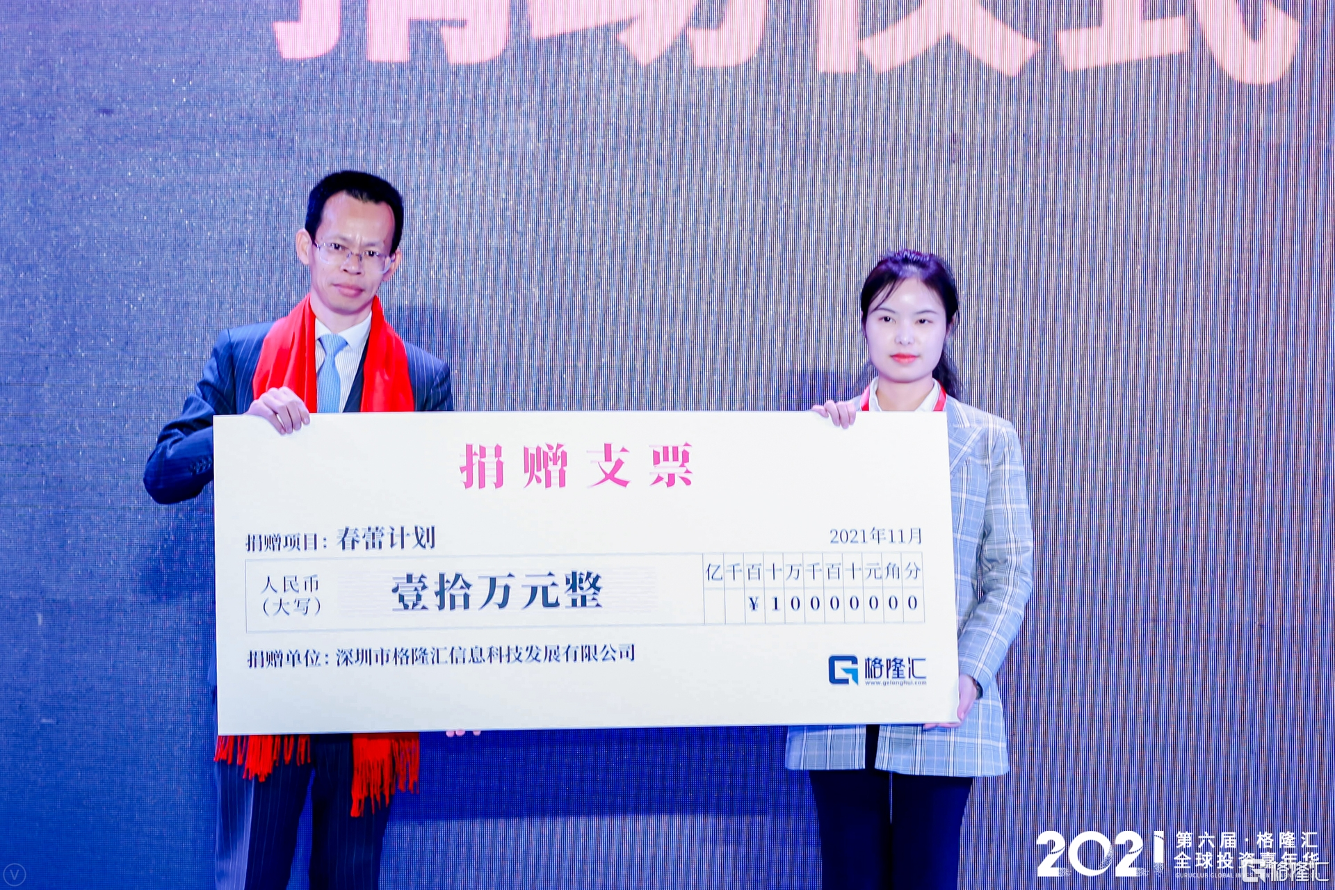 值得一提的是,緊接着別具一格的捐贈儀式就開始了——格隆匯秉承着“行天下事,積一分善”的初心,決定將此次活動的門票收入10萬元全部捐贈給春蕾計劃,用行動呵護花蕾,陪伴花開。
