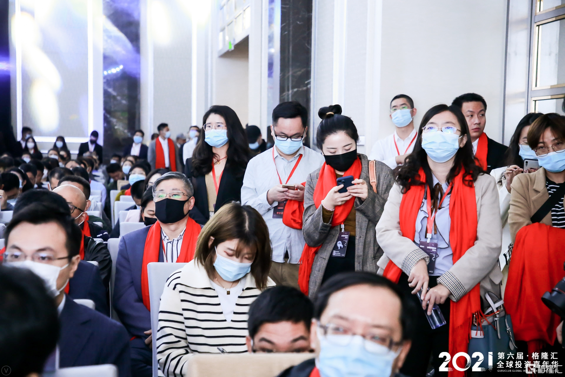 (今天大家脖子都掛着火紅色,排隊之餘也不忘和格隆匯展板合影,嘿嘿,今兒它可是“寵兒”)