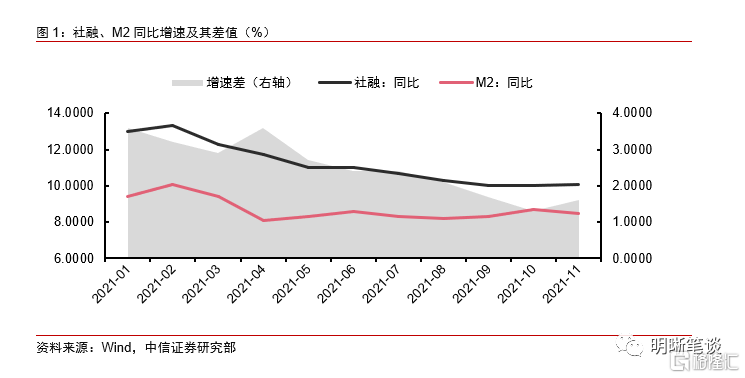 近期央行發佈11月金融數據,社會融資規模存量同比10.1%,較前值回升0.1個百分點,M2同比增長8.5%,較前值下滑0.2個百分點,“社融-M2”增速差自今年4月以來首次出現回升。作為債市收益率變化的領先指標之一,“社融-M2”增速剪刀差的變化或許暗示了債市新一輪趨勢的起點。