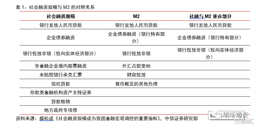 社融與M2反映貨幣的供需兩面。指標構造上,社融主要包括人民幣貸款、非標融資、債券和股票融資(2018年新加入ABS、地方政府專項債和貸款核銷三項);而M2包括流通中的現金和非存款類機構儲存於存款類金融機構的存款兩部分,派生渠道包括銀行體系對非金融機構貸款、購買企業債券、政府支出(或回籠)和其他項(軋差,包括銀行自營非標、委外等)。二者主要區別在於統計的切入視角有異,M2從銀行負債端展示傳統間接融資渠道釋放的貨幣量,社融則從實體企業的角度考量金融對實體的支持力度,主要統計差異在於社融包括非銀行渠道融資尤其是直接融資,同時並不包括銀行向非銀投放的未流向實體經濟的部分。從這一角度而言,社融可被看做貨幣的總需求,而M2則是貨幣的總供給。
