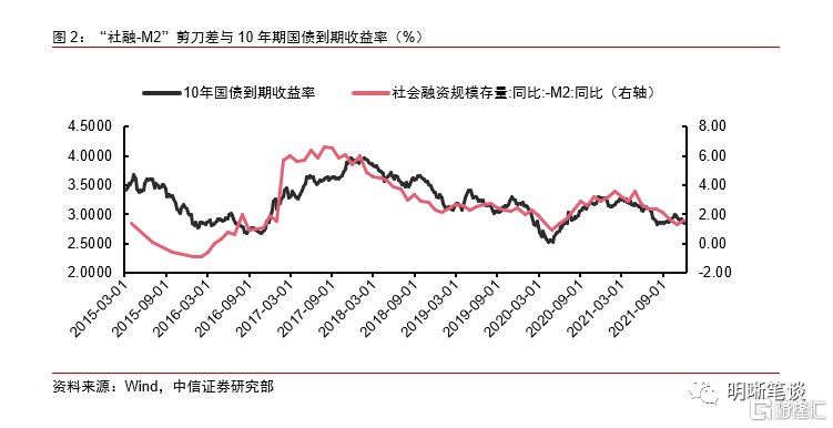 “社融-M2”增速差反映了貨幣供需矛盾間的較量,是利率的先行指標,當增速差擴大,利率水平預計將隨之抬升。根據我們此前對於社融和M2的理解,二者增速差值走闊,表明實體經濟的融資需求或資產擴張速度快於銀行M2的派生擴張速度,信用主體對貨幣的需求更加旺盛,因此對應更高的資金價格,並最終反映到利率這個衡量指標。若無基礎貨幣的超預期緊縮或擴張,理論上“社融-M2”同比增速差應當與10年期國債收益率呈現出正相關關係。歷史數據同樣支持“社融-M2”背後的信用-貨幣觀點,且我們發現“社融-M2”的拐點相對靠前,對於債市走勢有較好的風向標意義。