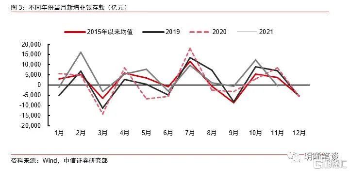 11月非銀行業金融機構存款減少257億元,同比多減8773億元,是拉動M2同比下滑的首要原因。觀察以往11月非銀存款的情況,2015年以來11月平均增幅3642億元,近幾年更是持續走高,2019年同期增長6979億元,2020年更是創下了8516億元的歷史高值。然而,今年11月非銀存款卻減少257億元,較同期多減近9000億元。