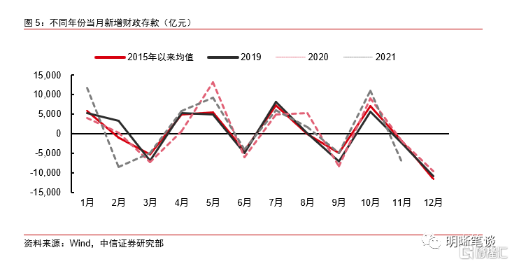 11月財政存款減少7281億元,同比多減5424億元,是M2下滑的另一個主要原因。財政存款的變化一般具有較強的季節性,往往季初月收大於支、存款增加,季末月支大於出、存款減少。對於11月來説,通常規模會減少2000億元左右,然而今年11月財政存款減少7281億元,同比多減5424億元。11月M2同比增長值較10月下滑2430億元,顯然在居民企業定期存款貢獻正增長的同時,財政存款下降是M2下滑的另一個主要拖累項。
