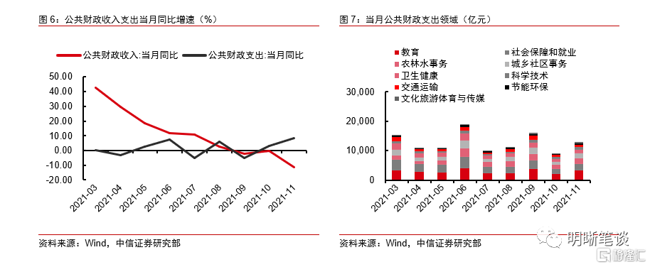 今年11月財政存款在政府債淨融資額維持較高水平的背景下,但存款卻出現同比多減且規模較大,反映財政支出力度較大,政策穩增長的意圖明顯。12月17日財政部公佈2021年1-11月財政收支情況:2021年1-11月全國一般公共預算收入19.12萬億元,同比增長12.8%(1-10月為增長14.5%);全國一般公共預算支出21.39萬億元,同比增長2.9%(1-10月為增長2.4%)。從當月同比數據可以更直觀的感受到經濟增速下行壓力下税收收入放緩但財政支出發力支持經濟。從後續投向來看,教育社保還將是重點投向的領域,但節能環保、農林水事務、交通運輸等基礎設施建設領域也有較大的發揮空間。