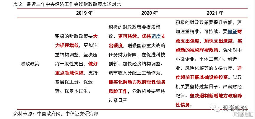 從今年12月舉行的中央經濟工作會議的部署來看,財政政策定調明顯比去年更加積極,表述中隱含了擴張趨勢。中央經濟工作會議財政政策基調較去年的變化是比較顯著的,去年的提法是“保持適度支出強度”“抓實化解地方政府隱性債務風險工作”,而今年的提法變為“保證財政支出強度,加快支出進度”“實施新的減税降費政策”和“適度超前開展基礎設施投資”。因此,不論是一般公共預算還是政府性基金,明年大概率都會有所擴張。財政的表述有兩點值得關注:一方面,保證支出強度的同時減税,意味着一般公共預算的真實赤字需要進一步擴張,預計會繼續保持3%以上的赤字率,且大概率較2021年有所提高,此外也可能使用更多的調入和結餘結轉資金;另一方面,“堅決遏制新增地方政府隱性債務”的同時,“保證財政支出強度”,意味着明年對於顯性債務的依賴程度更高——地方政府新增專項債和一般債的規模大概率繼續上升。