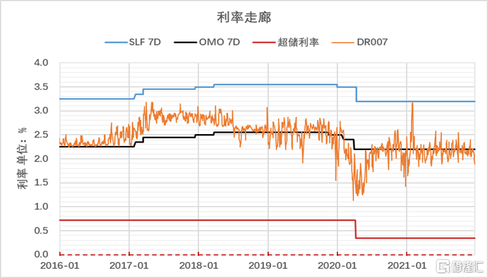 2022年,貨幣政策仍將保持流動性合理充裕,引導貨幣市場利率圍繞央行公開市場操作7天期逆回購利率上下波動。由於上半年穩增長壓力更大, DR007中樞偏下的概率略高。今年前三個季度DR007均值分別爲2.21%,2.16%和2.16%,四季度小幅回升。基準情況在政策操作利率預計保持不變下,明年中樞預計在2.1%-2.2%,全年波動區間預計在1.8%-2.4%之間。