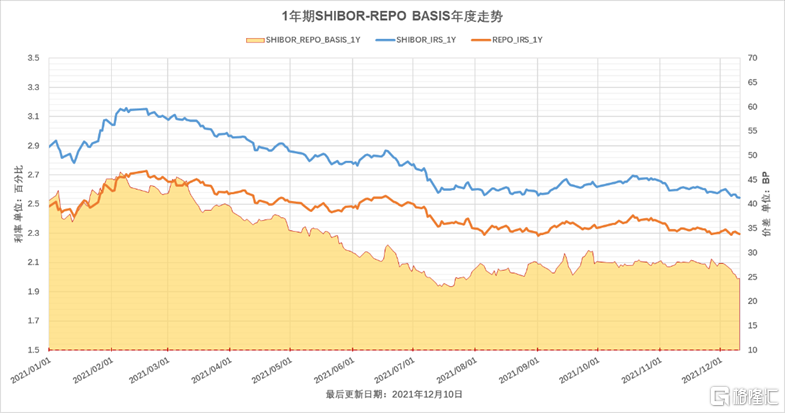 2022年穩健的貨幣政策靈活適度,流動性保持合理充裕,財政政策和貨幣政策協調聯動,跨週期和逆週期宏觀調控政策有機結合。FR007利率互換波動幅度可能較SHIBOR 3M利率互換偏小。而存單利率將可能受供求關係驅動小幅回升,向1年期MLF利率靠攏。在供給端,隨着信貸需求回暖,存單發行訴求有望提升;在需求端,明年政府債券發行大概率前置,機構欠配壓力相應緩解,流入存單市場的增量資金將有所減少。存單發行利率可能出現小幅上行,帶動SHIBOR 3M利率上行,SHIBOR 3M /FR007基差整體呈走擴狀態。
