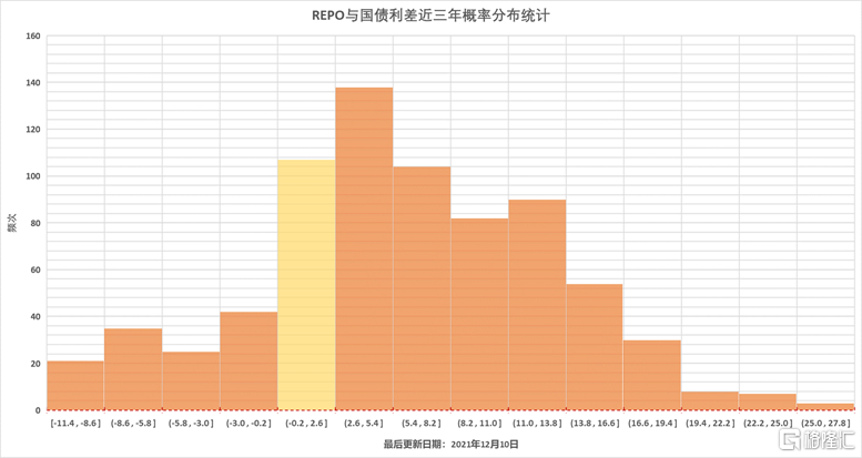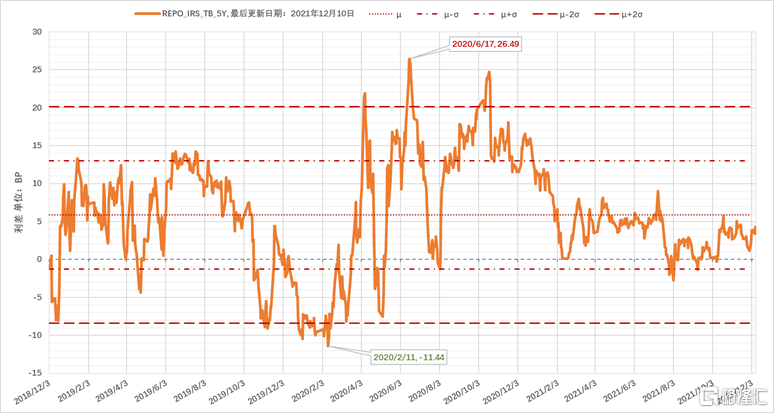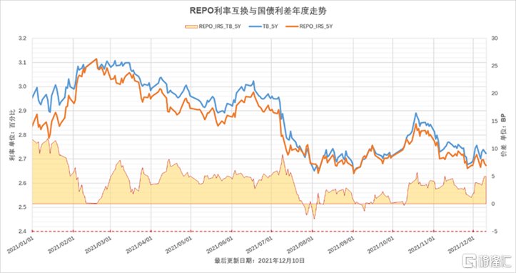 2021年5年國債和互換的利差波動範圍較前幾年明顯收斂(-2,11)區間,目前1BP,處於歷史分位24%,考慮到利率互換基準利率有跟隨政策利率下行可能、財政前置下國債發行量上升等因素影響,預計2022年國債互換利差有走擴機會。