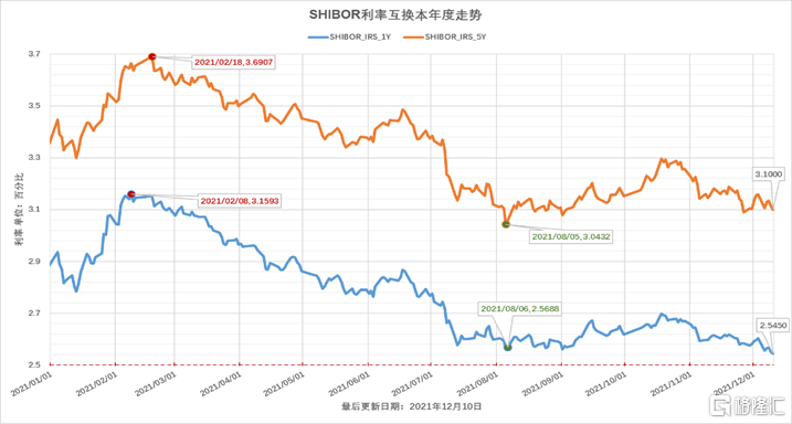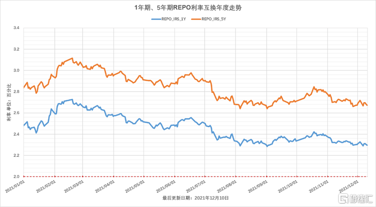 長期限品種互換利率與債券利率走勢相關性更強,具體取決於基本面、貨幣政策等因素的預期差。總體看,當前經濟基本面回落壓力較大,短期內長期限互換利率反彈空間有限,以低位震盪爲主,2022年年初財政發力或信貸開門紅或帶來擾動,預計5年期FR007利率互換預計主要波動區間2.50%-2.80%,5年期SHIBOR 3M利率互換預計主要波動區間2.90%-3.20%。