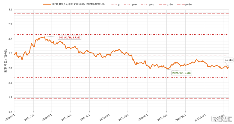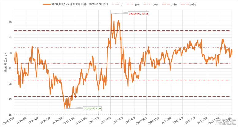 1年期FR007利率互換全年波動區間爲2.28%~2.73%(共計44BP),近三年標準差爲0.2936。當前固定端利率爲2.3025%,與2020年7月利率水平較爲相近,從過去三年的統計數據來看,約在13.0%的歷史分位水平。